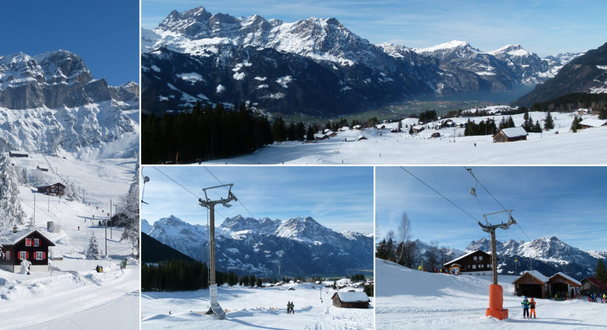 Zwei Skihäuser am Pistenrand und ein gigantischer Blick auf die Bergwelt des unteren Reusstals machen das Schneesport-Vergnügen perfekt.